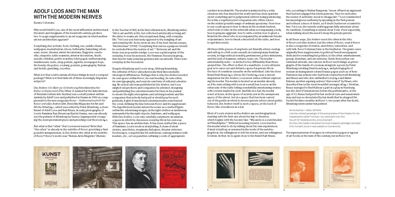 In 1903, Adolf Loos, one of the sharpest and most influential architects and critics of the twentieth century, edited the astonishing journal “Das Andere” (The Other), subtitled “Ein Blatt zur Einführung abendländischer Kultur in Österreich” (A Journal for the Introduction of Western Culture into Austria). Only two issues were published of what is today considered one of the most important documents of modernity – a radical, at times shocking statement in which nothing was off limits, from fashion to masturbation.