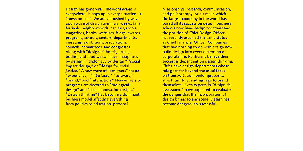 Colomina’s and Wigley’s field notes offer an archaeology of the way design has gone viral and is now bigger than the world. They range across the last few hundred thousand years and the last few seconds to scrutinize the uniquely plastic relation between brain and artifact. A vivid portrait emerges.