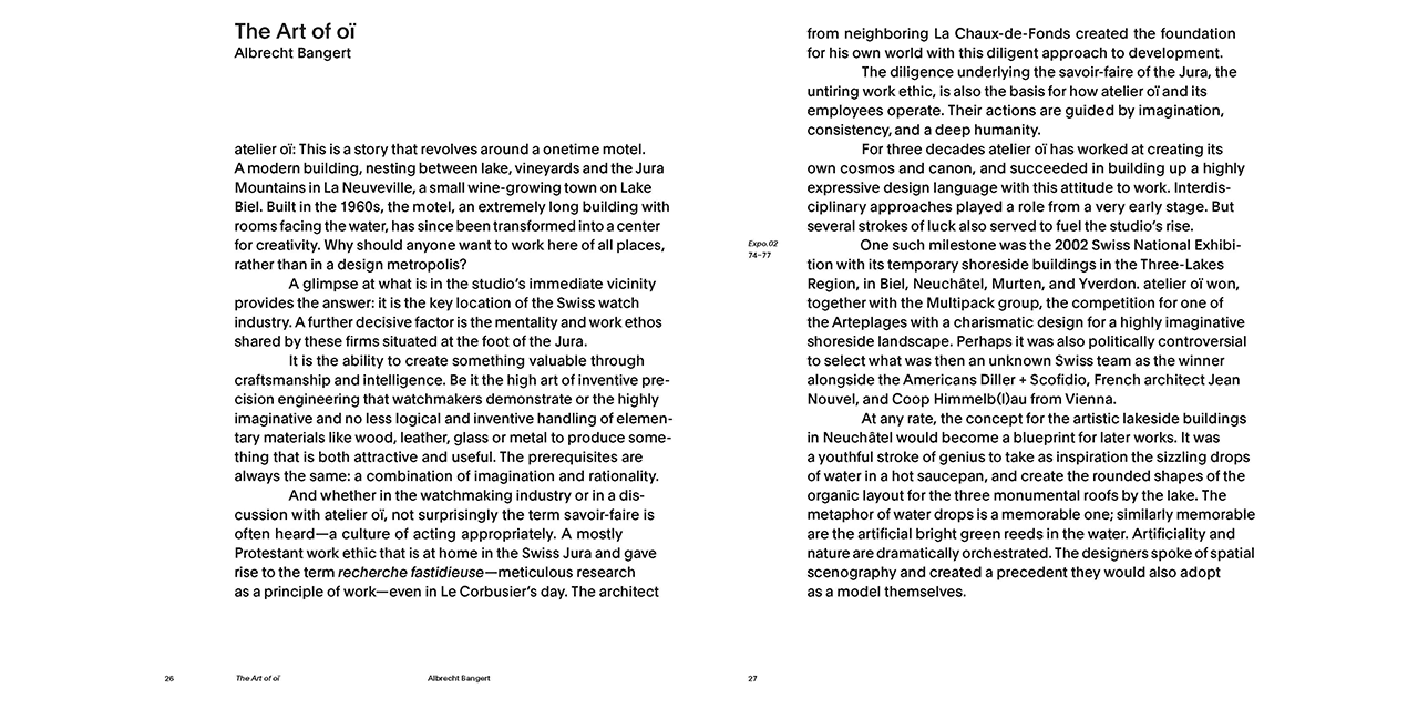 How Life Unfolds provides an insight into the approach, methods and processes of the popular design studio atelier oï based in La Neuveville, Switzerland. atelier oï pushes the boundaries of architecture, product design and scenography and experiments with various textures and dimensions. The troika – Aurel Aebi, Armand Louis and Patrick Reymond – presents surprising design solutions that are remembered by the public as icons – be it the Arteplage at Expo 2002 in Neuchâtel, a precious perfume bottle or floating paper installations.