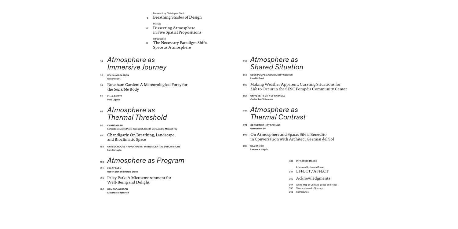 How will the human body, collective and individual, cope with the estimated increases in global air temperatures and in the earth’s corresponding thermal stress? Atmosphere Anatomies: On Design, Weather, and Sensation offers an in-depth examination of design strategies that situate the body and its bioclimatic milieu at the core of their spatial formation.