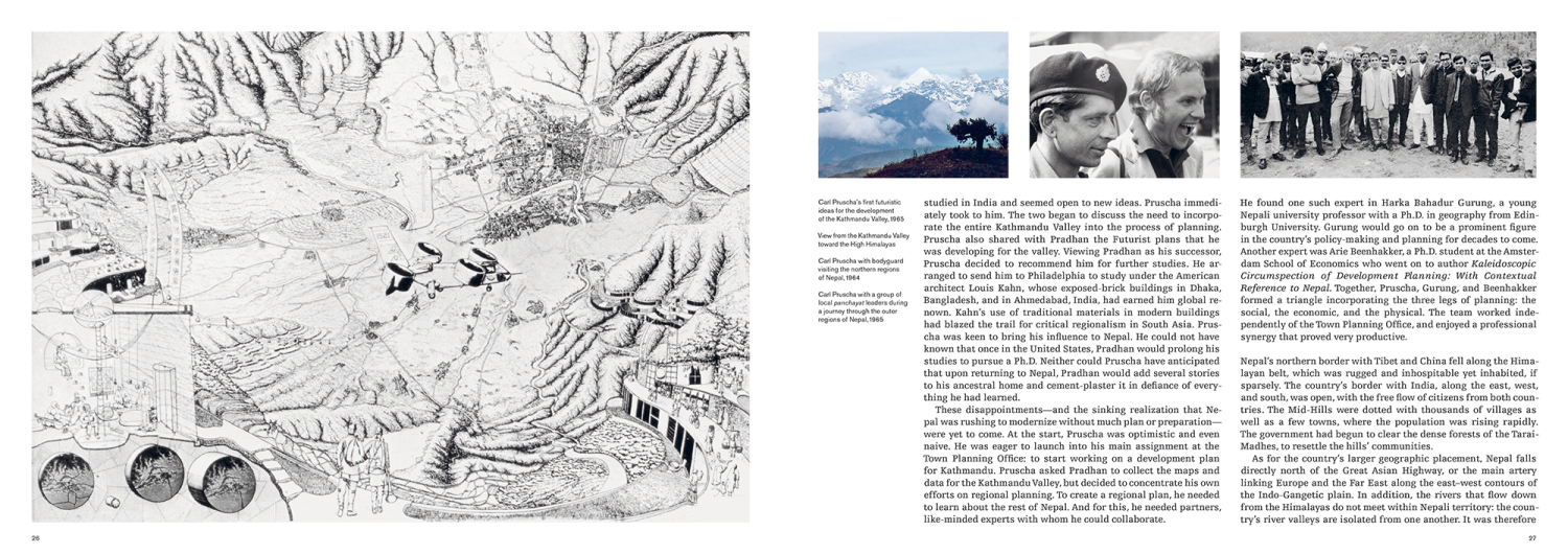 Carl Pruscha is an unusual architect. His works are found in New York, Kathmandu, and Vienna. Far removed from each other, these three geographical areas profoundly influenced his outlook and career. In the United States Pruscha planned visionary and utopian projects. He began to deal with the real world in Nepal where the UN had sent him as a consultant in 1964. In this foreign culture the young architect grew with the challenge. Aside from complex development proposals for the Kathmandu Valley he created remarkable buildings that blend tradition and Modernism in close harmony with their natural and landscape environment.
