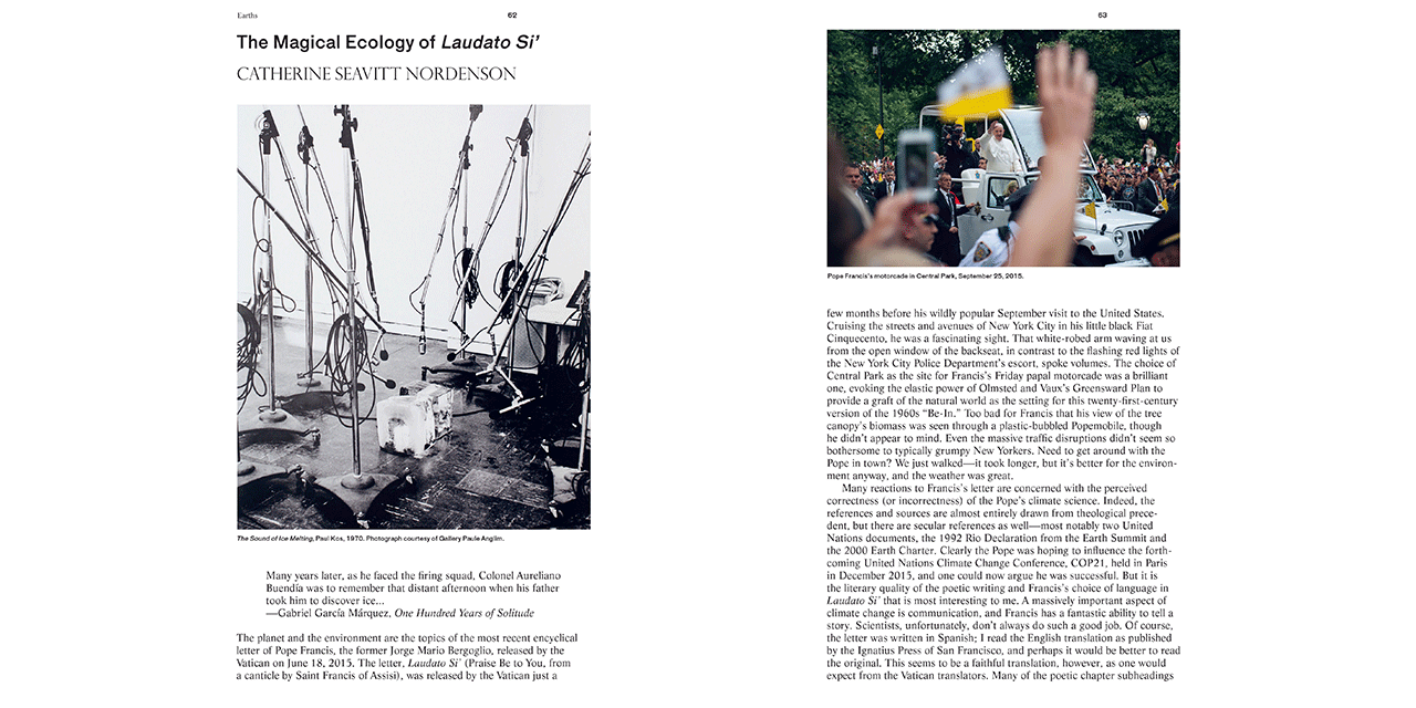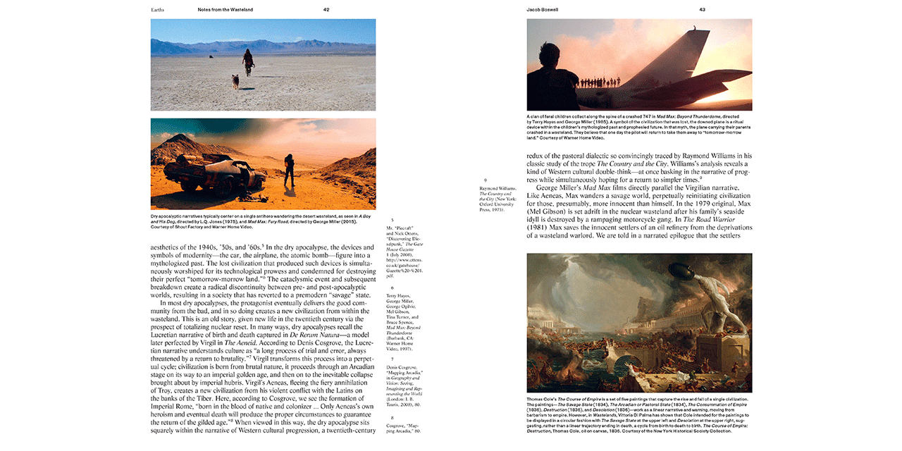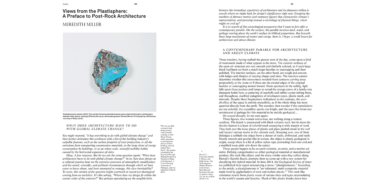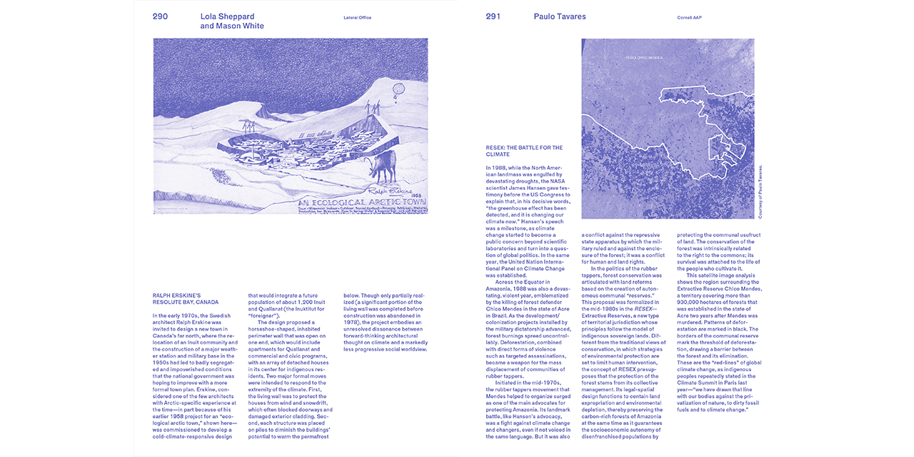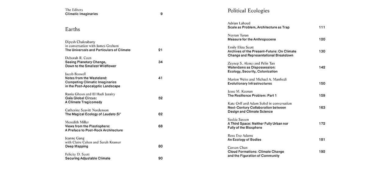 The essays, notes, projects and conversations are grouped in chapters on Earths, Political Ecologies, Corporealities and Enclosures, accompanied by images, illustrations and sketches. The publication is a project of The Avery Review, a journal produced by the Office of Publications at Columbia University’s Graduate School of Architecture, Planning and Preservation.
