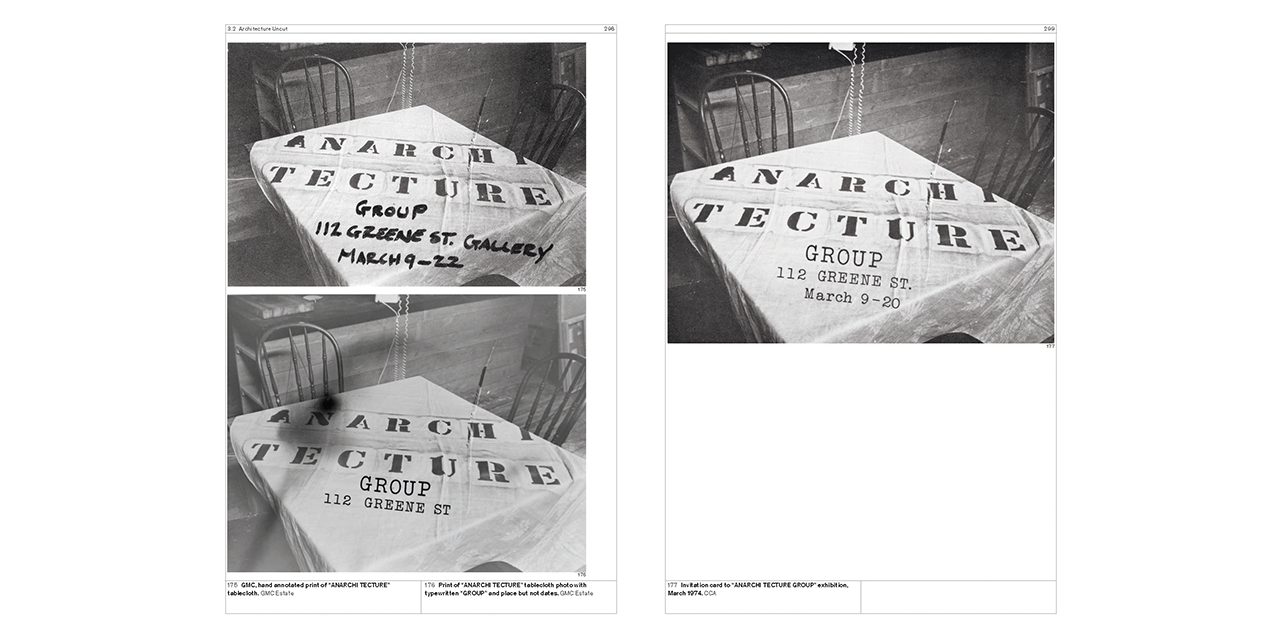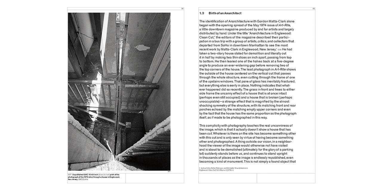 The Anarchitecture group show at the fabled 112 Greene Street gallery – an artistic epicenter of New York’s downtown scene in the 1970s – in March 1974 has been the subject of an enduring discussion, despite a complete lack of documentation about it. Anarchitecture, a collective challenging all conventional understandings of architecture, has become a foundational myth, but one that remains to be properly understood. Cutting Matta-Clark investigates the group through extensive interviews with the protagonists and a dossier of all the available evidence.