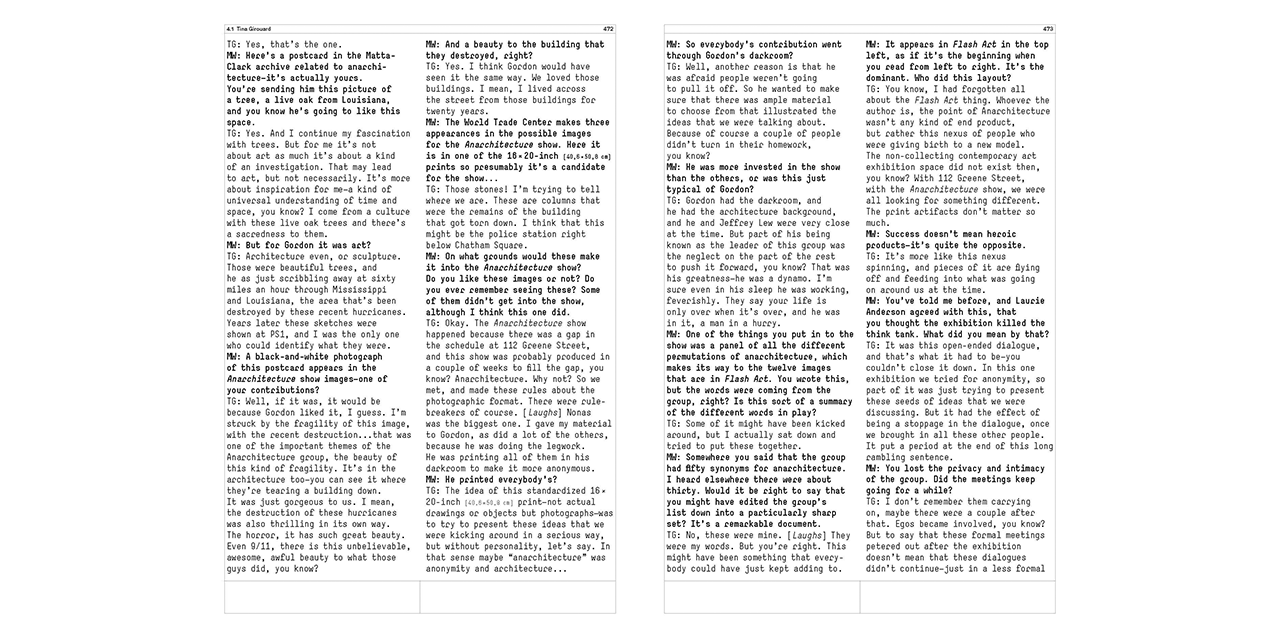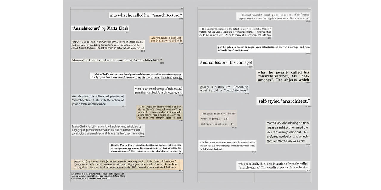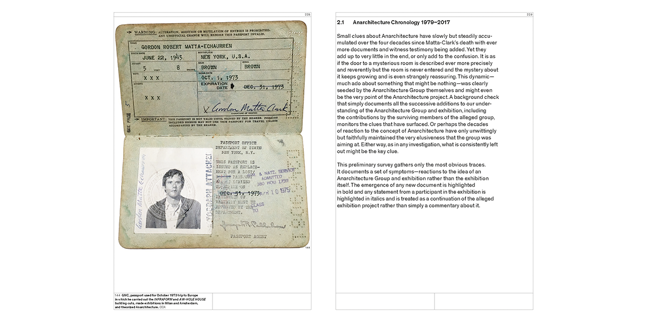 Stemming from a series of meetings, organized by Gordon Matta-Clark and reflecting his long-standing interest in architecture, the Anarchitecture exhibition was conceived as an anonymous group statement in photographs about the intersection of art and building. But did it actually happen? It exists only through oblique archival traces and the memories of the participants.