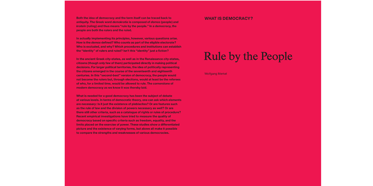Democratically-ruled nations try to strike a difficult balance between equality and liberty, as well as between majority and minorities. They try to maintain order in society while allowing for the greatest possible expressions of opinion. Democracy demands and democracy challenges—and as a system of government, democracy is itself challenged today by globalization and the development of digital media. Against this background, and in light of political and economic events in Asia or in the Arab world, there is another incessant question: is democracy still up-to-date? But of course! Democracies perform generally better and ensure peace more successfully than other forms of government.
