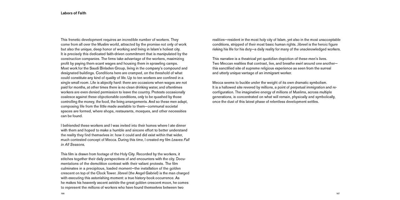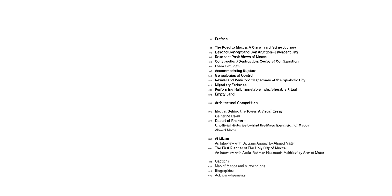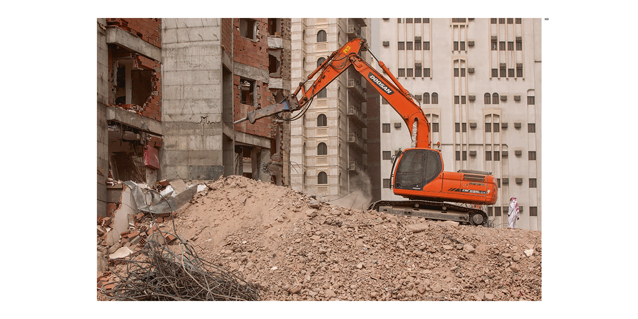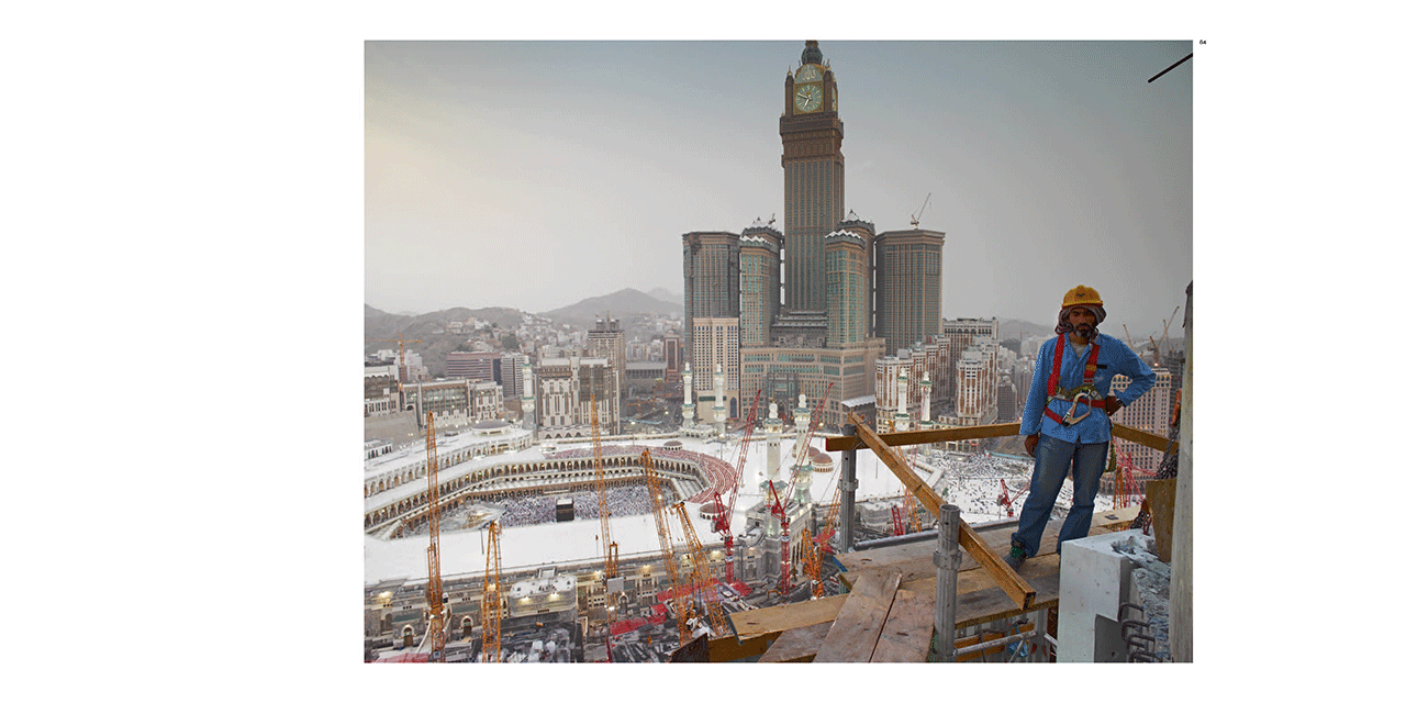 Mecca, until recently, embodied a unique urban tapestry, layered with histories that are stitched together by an abundance of organically rooted communities and cultures. It’s a place that accommodated not only sacred structures and sites but also huge fluctuations in population during Ramadan. More recently, these sites and communities have been eradicated and are being replaced by five-star-studded high rise developments, transforming it from an active metropolis to the world’s most exclusive, yet most visited religious tourist destination. This photographic essay is a celebration of Mecca's real and projected or imaginary states. It provides singular access to this site and its associated social and religious rituals, along with its architectural urban planned and proposed development.