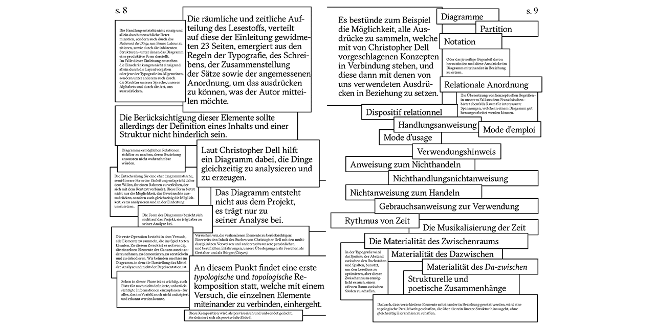 Eine Partitur ist eine besondere Darstellungsform. Sie wird mit Handlungsanweisungen verknüpft und schaut nach vorn anstatt nach hinten: auf die Planung eines bevorstehenden Ereignisses. Die «offene Partitur» geht noch einen Schritt weiter: Sie artikuliert den Prozess der Herstellung neuer Realitäten und dessen Unbestimmtheit.