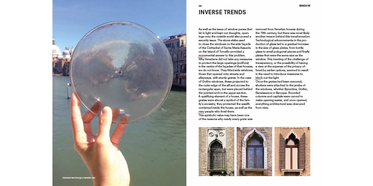 Developed as a parallel research project of Fundamentals—the exhibition at the 14th Venice Architecture Biennale curated by Rem Koolhaas—the book offers insights on Venetian façades, stairs, corridors, floors, ramps, ceilings, doors, hearths, windows, balconies and walls. “Product not [only] of the mind but of societal organization” the elements are isolated from their picture-perfect context and from the postcard view of Venice that is impressed in our retinas, introducing the reader—through a combination of collages, drawings, photographs, paintings, film stills and quotes—to a radically new way of seeing Venice. Like a camera obscura photograph cuts through the often irrelevant embellishments of architecture to reveal the underlying skeleton of a building (i.e. its elements), this guide will allow the reader to better understand the fundamental transformations that have shaped Venice during the past ten centuries. This city, which for many is—architecturally speaking—permanently frozen in time, has in fact often been at the forefront of challenging the architectural conventions and underwent an unprecedented urban transformation.