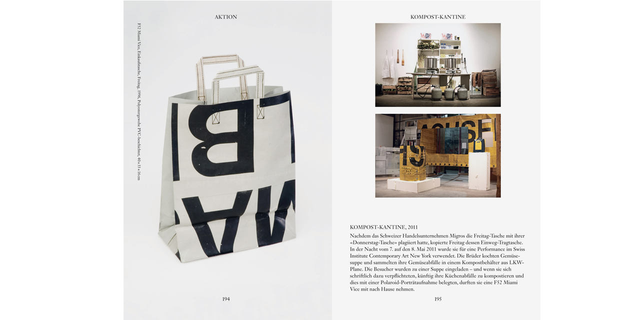 With its unique bags made of used materials, the Freitag company of Zürich is now an established commercial success, selling 300,000 of its design products around the world every year. How can a bag achieve that kind of cult status? How did a small, creative start-up become a large brand with a strong identity? Freitag – Out of the Bag investigates this story. Extensively illustrated interviews with the brothers Daniel and Markus Freitag and their coworkers and collaborators in the fields of product design, manufacturing, distributing, and marketing offer a look behind the scenes at the company, which manages as a brand to embody — through often humorous and ironic communications strategies — the paradox of an individualistic mass product.
