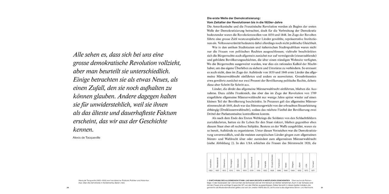 Seit der Antike und bis heute wird darüber diskutiert, ob Demokratie nun die beste Staatsform sei und welches die Merkmale einer guten Demokratie sind. Sicherlich gibt es nicht die «perfekte» Demokratie. Demokratisch regierte Staaten stellen sich der schwierigen Balance zwischen Gleichheit und Freiheit, Mehrheit und Minderheit, einer geordneten Gemeinschaft und einem lebendigen Meinungspluralismus. Demokratie fordert – und ist als System selbst gefordert, angesichts von Globalisierung und digitaler Medienentwicklung. Vor diesem Hintergrund und aufgrund der politischen und wirtschaftlichen Entwicklungen in Asien oder in der arabischen Welt wird immer wieder gefragt, ob die Demokratie noch zeitgemäss sei. Aber ja! Demokratien sind leistungsfähiger und friedenssichernder als andere Regierungsformen.