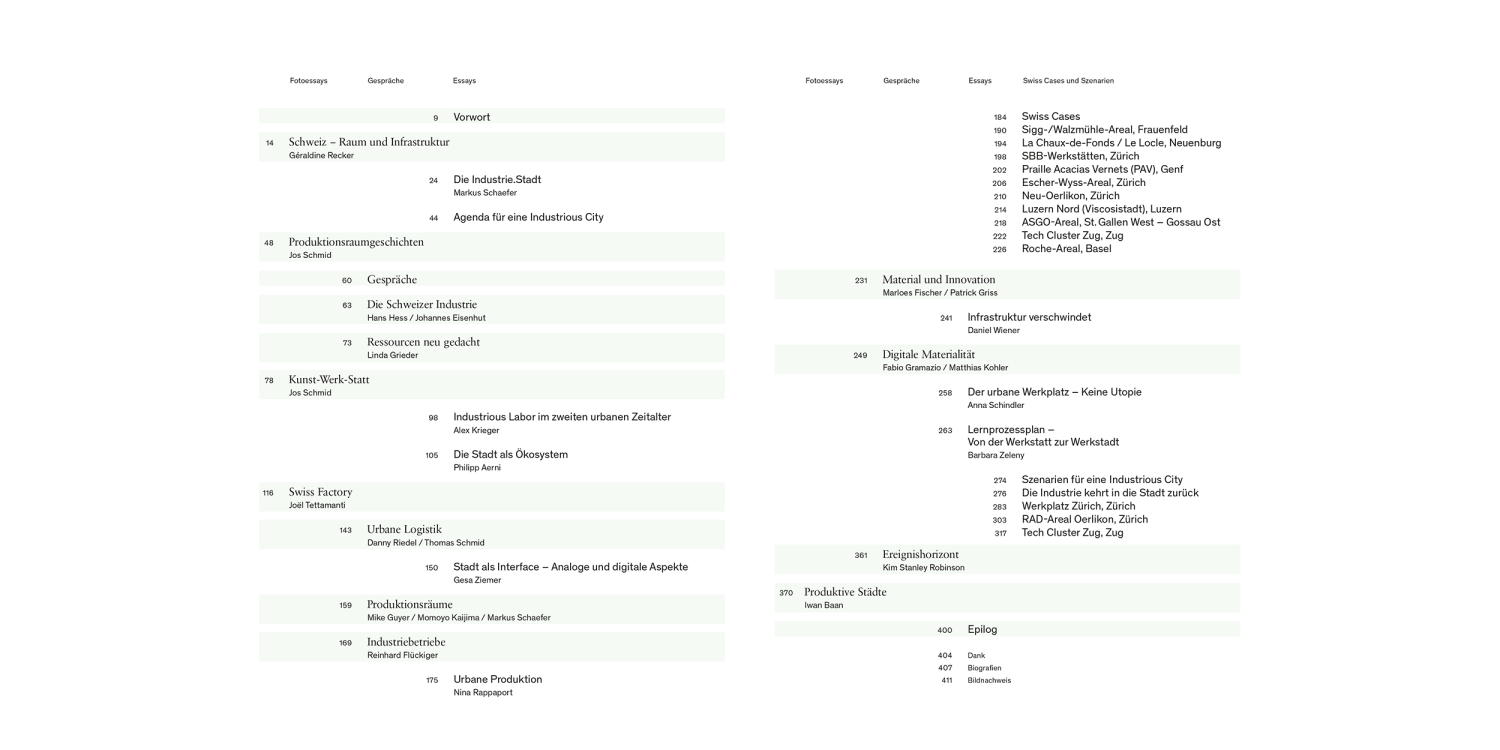 Geleitet vom Züricher Architekturstudio Hosoya Schaefer hat das interdisziplinäre Forschungsprojekt «The Industrious City: Rethinking Urban Industry in the Digital Age» an der Harvard University Graduate School of Design diese Fragen untersucht. Die daraus resultierende Publikation Industrie.Stadt beschreibt am Beispiel der polyzentrischen, urbanen Landschaft der Schweiz Wege, wie die Produktion in die Städte zurückgeführt werden kann. Eine neue urbane Industrie wird unsere soziale, politische, räumliche und wirtschaftliche Lebenswelt prägen und neue Synergien zwischen Produktion, Dienstleistung, Freizeit und Wohnen ermöglichen.