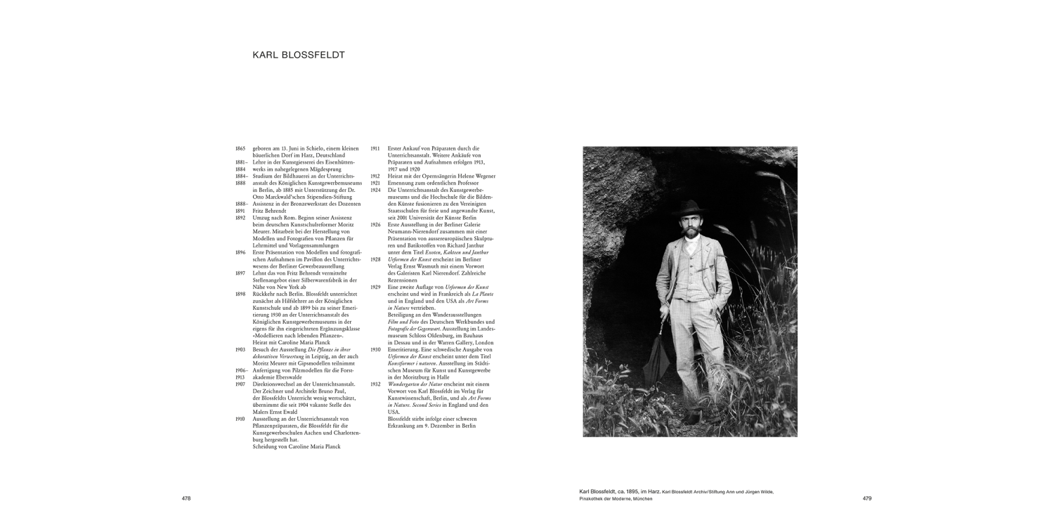 In den 1890er-Jahren begann der Berliner Künstler, Bildhauer und Dozent Karl Blossfeldt mit dem Fotografieren von Pflanzen, Samen und anderen Naturmaterialien, um seinen Schülern in der Natur vorkommende Muster und Formen zu zeigen. Seine Nahaufnahmen kleinster Pflanzenteile, die er bis zu 30 Mal vergrösserte, überraschen durch ihr geometrisches und skulpturales Erscheinungsbild. Blossfeldts Fotosammlung wurde erstmals 1928 unter dem Titel Urformen der Kunst veröffentlicht und war eine Sensation. Die Publikation wurde zu einem internationalen Bestseller und bleibt bis heute eines der bedeutendsten Fotobücher des 20. Jahrhunderts.