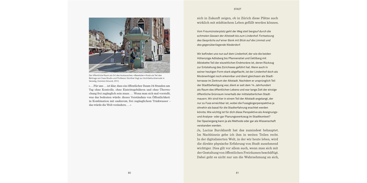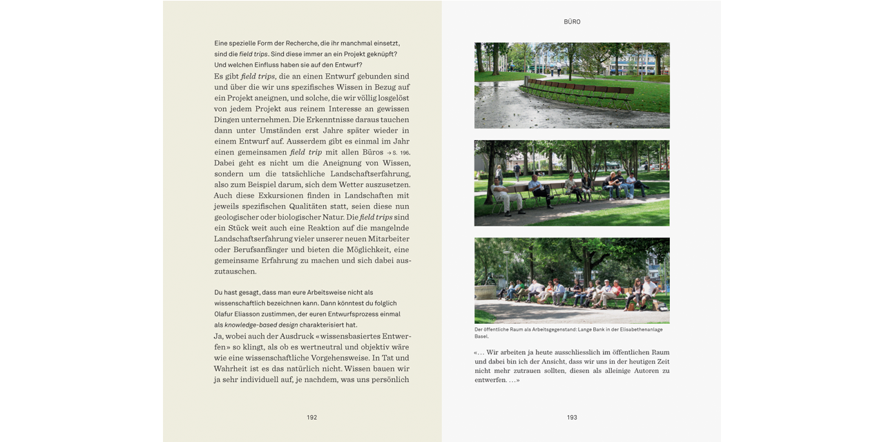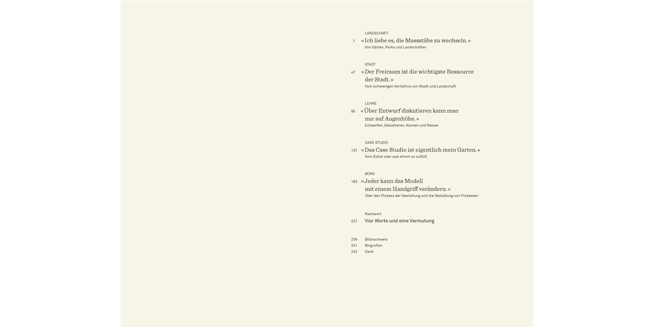 An fünf Schauplätzen spricht Günther Vogt über aktuelle Themen der Landschaftsarchitektur, ihr Verhältnis zur Architektur und zur Stadt, über seine Lehre an der ETH Zürich und die Arbeit von Vogt Landschaftsarchitekten. Das vorliegende Buch kann also gleichsam selbst als Wunderkammer gelesen werden, indem es Einblick in den vielfältigen Kosmos von Günther Vogts Denken und Arbeiten gewährt und letztlich nach einer Haltung fragt.