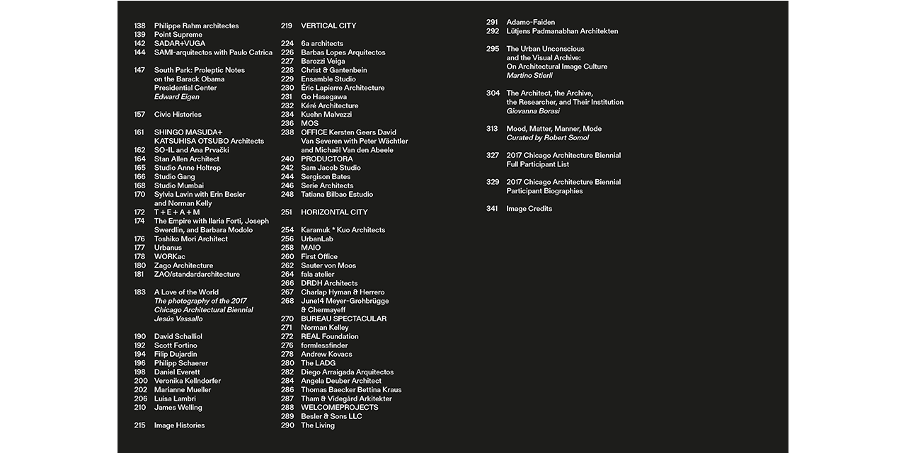 The 2017 Chicago Architecture Biennial focuses on the efforts of contemporary architects to align their work with versions of history. The act of looking to the past to inform the present has always been central to architecture. The biennial and hence the book present the chance to consider anew the role history plays in the field today and to try to rethink this collective project of architecture.