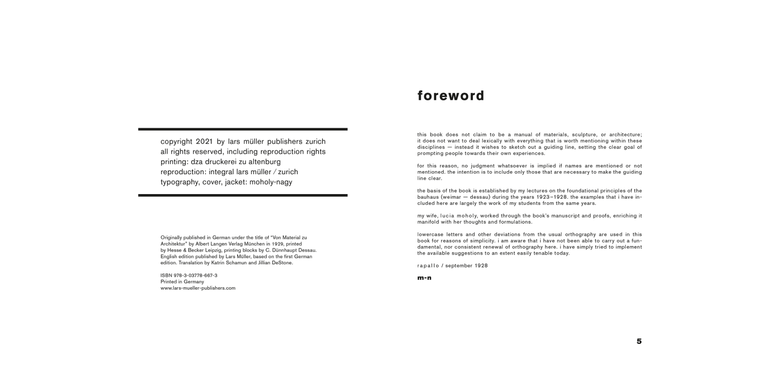 Published in 1929, From Material to Architecture contains the main features of László Moholy-Nagy’s teaching program at the Bauhaus. With its focus on the preliminary course, this last book of the 14-volumes series explains how students “develop towards practice from day to day.” The educational principle behind it, "Jedermann ist begabt" (everyone is talented), was central to teaching at the Bauhaus from 1919 to its conclusion in 1933.