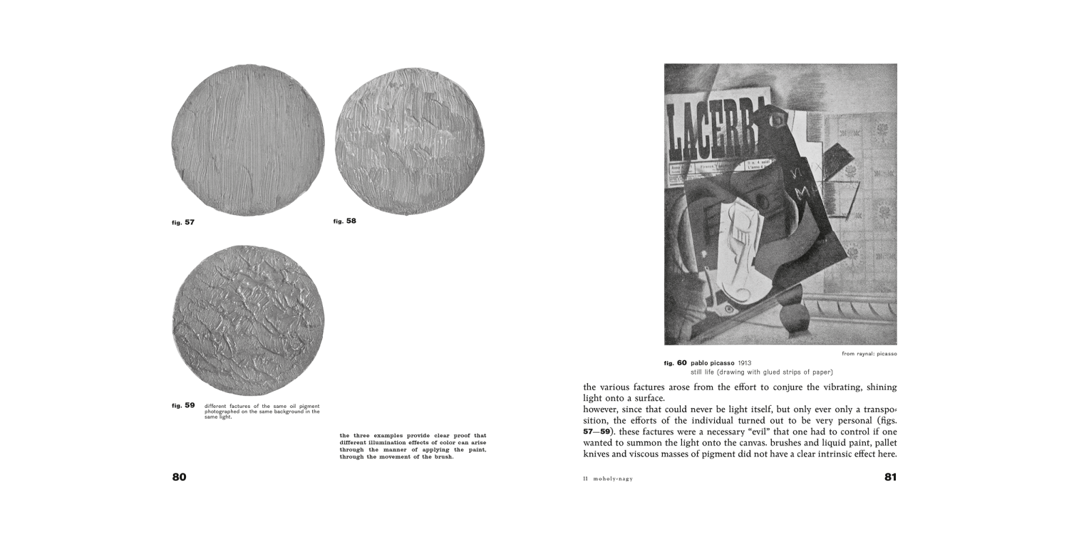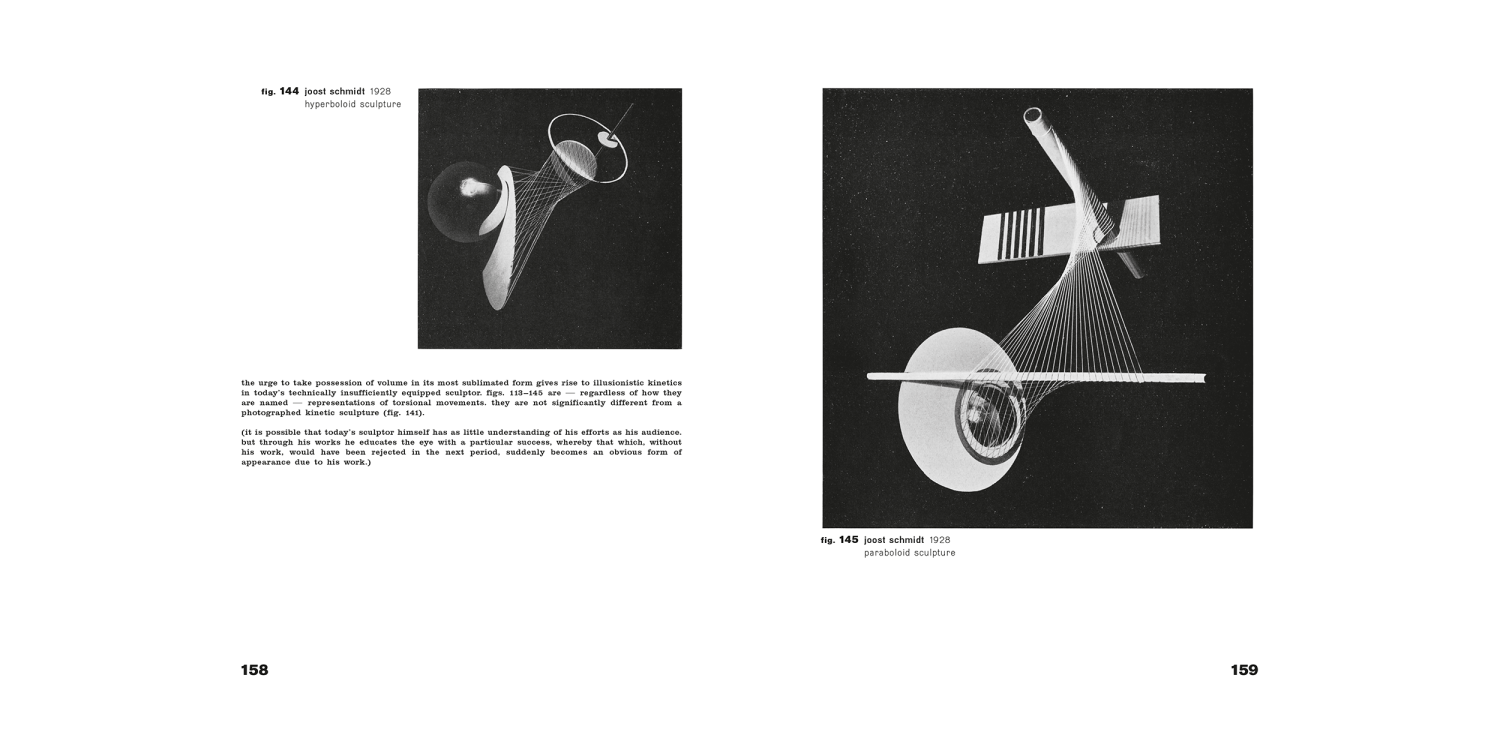 Moholy-Nagy’s second contribution within the series (he also wrote Painting, Photography, Film, volume 8) searches “for the closest connection between art, science and technology by aiming for the training of finer sensory perception.”