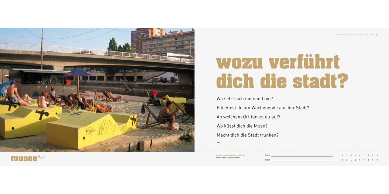 Bald werden mehr als zwei Drittel aller Menschen in Städten leben und die Zahl der immer mobiler werdenden Menschen, die mühelos zwischen den Metropolen pendeln, wächst kontinuierlich. Verschiedene Städterankings wählen jährlich weltweit die «Top Ten» der Städte. Aber was macht eine Stadt wirklich lebenswert? Auf diese Frage geben die Rankings nur unzureichend Antwort. Ihre ökonomisch ausgerichteten, quantitativen Kriterien sind oft aus dem Kontext gerissen und erscheinen als die einzig ausschlaggebenden, allgemein erwünschten Lebensqualitäten der Stadt. Persönliche Erfahrungen sind aber vielschichtiger.