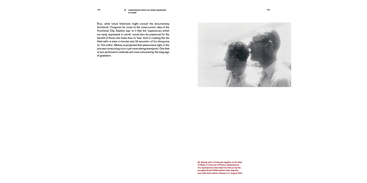 The book concerns the four-day cruise to the Aegean islands made by the "inner circle" of the International Congress of Modern Architecture (CIAM) and their friends during the 4th congress in August 1933. Structured around that sequence of Moholy-Nagy's film Architects' Congress dealing with the cruise, the book sheds light on this legendary event in the history of the European architectural and artistic avant-garde.