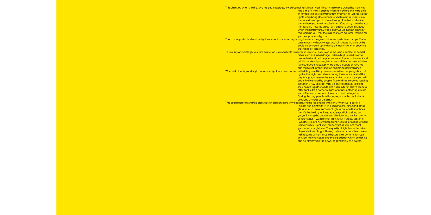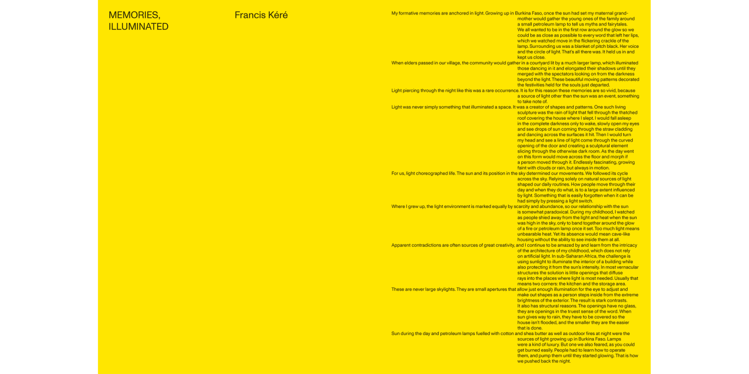 On the initiative of the lighting company Zumtobel Group, architectural photographer Iwan Baan and architect Francis Kéré set out to capture how the sun’s natural light cycle shapes vernacular architecture in Burkina Faso. Iwan Baan’s pictures are accompanied by architectural sketches from Francis Kéré, who grew up in this light environment and whose architecture is inspired by it.