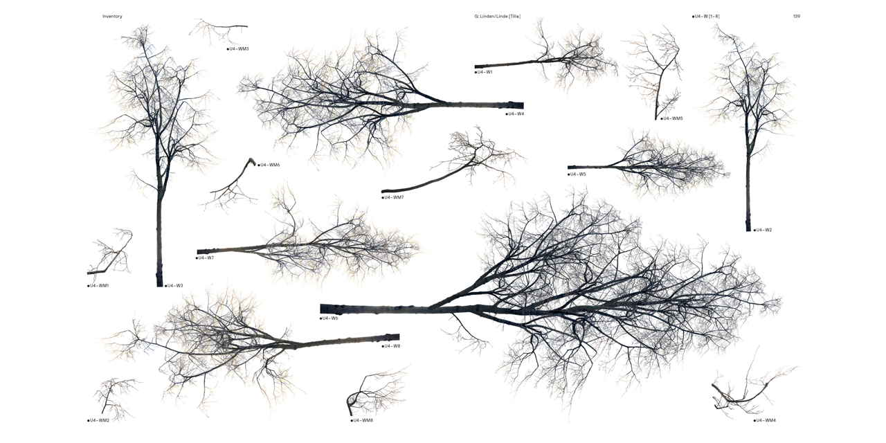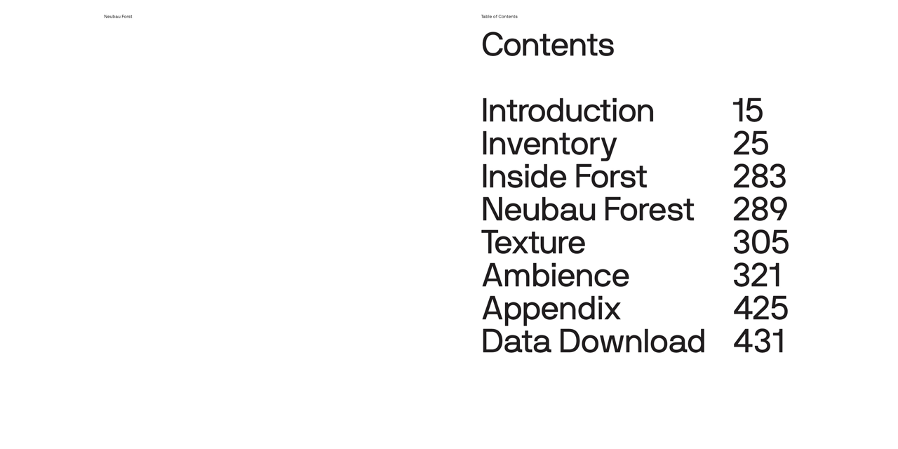 Neubau Forst Catalogue is the 432-page print catalogue of a digital collection of tree silhouettes and sculptures seen at different seasons. Working by hand, the Neubau designers digitally removed the trees from their original Berlin surroundings and thereby crafted a body of visual material whose scope, outstanding quality of detail and excellent image resolution sets it clearly apart from conventional tree libraries compiled with autotracing tools. The trees, which were systematically photographed in summer and winter over several years, assume a timeless validity through Neubau’s process of selection and are thus universally applicable for future visualizations.