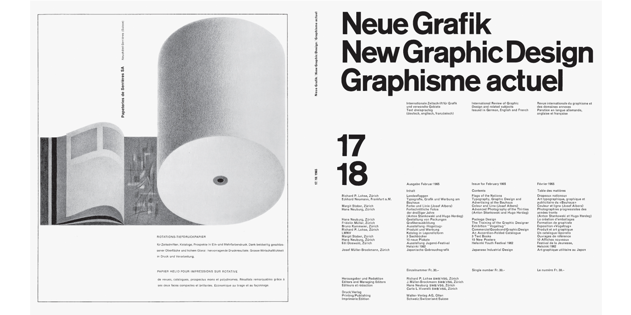 Neue Grafik, the “International review of graphic design and related subjects”, was initiated by Swiss designer Josef Müller-Brockmann. It was published in eighteen issues between 1958 and 1965 by an editorial collective consisting of Müller-Brockmann, Richard Paul Lohse, Hans Neuburg und Carlo Vivarelli ( LMNV ). The complete volumes are now available as a facsimile reprint.