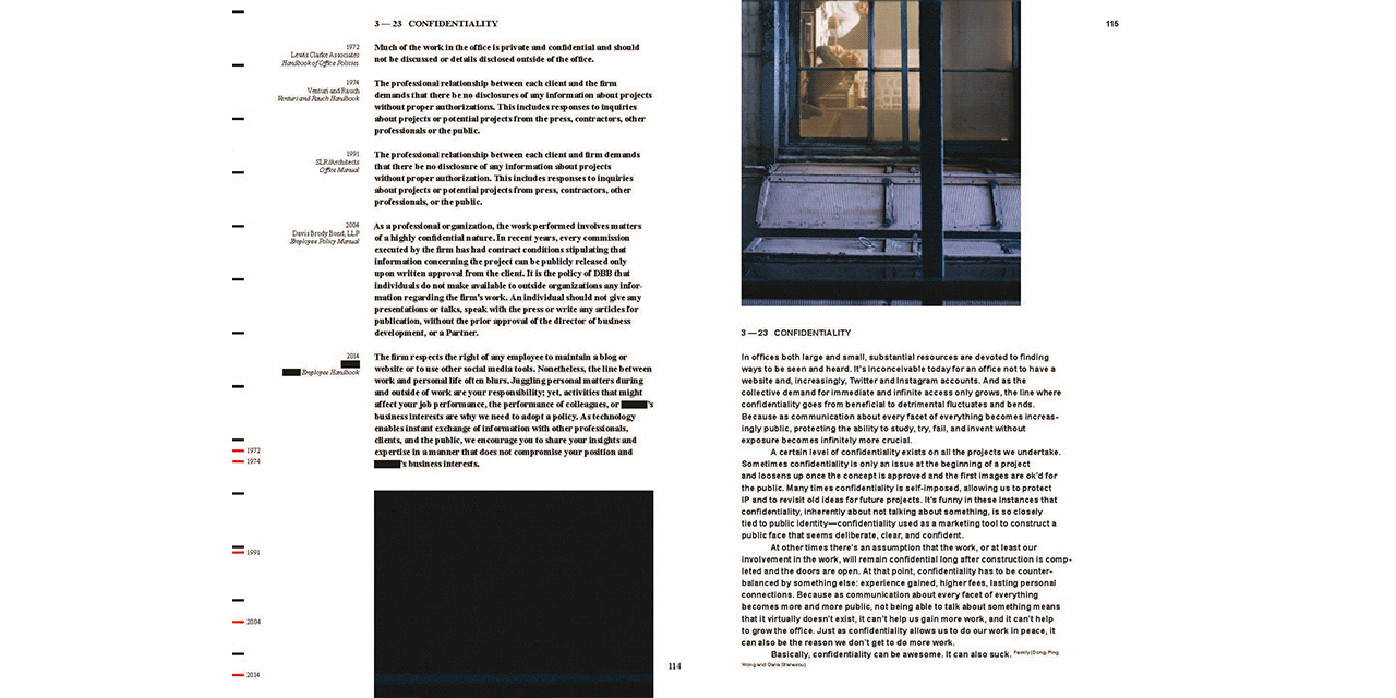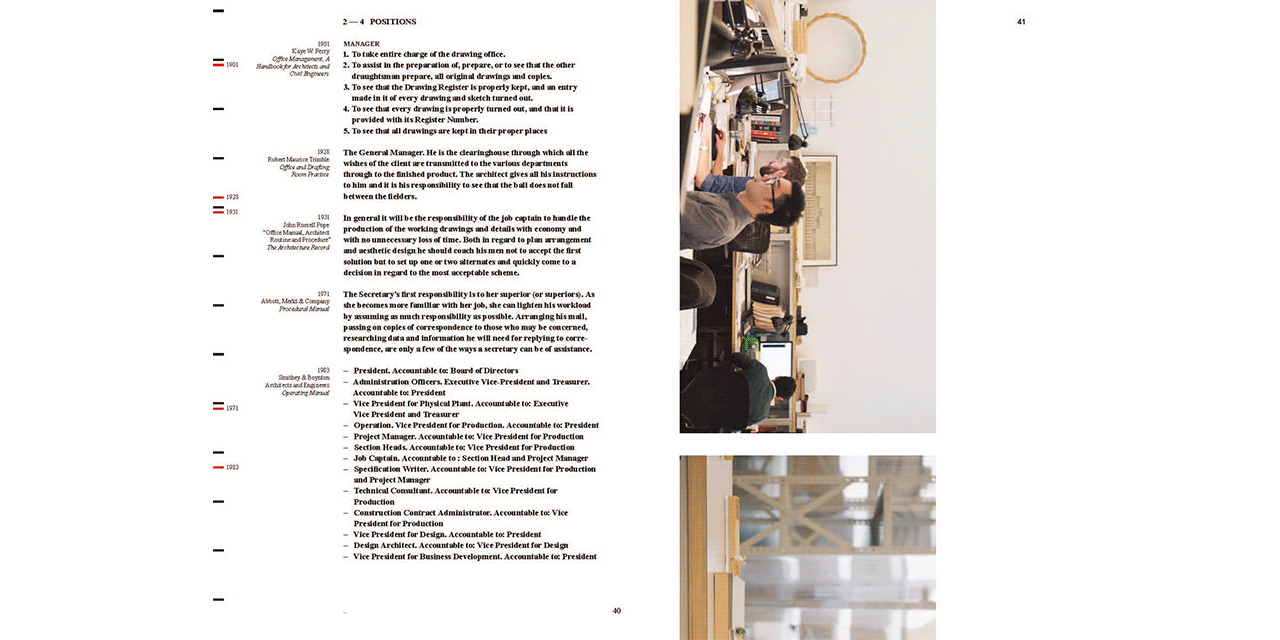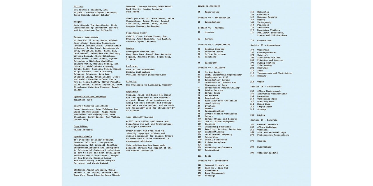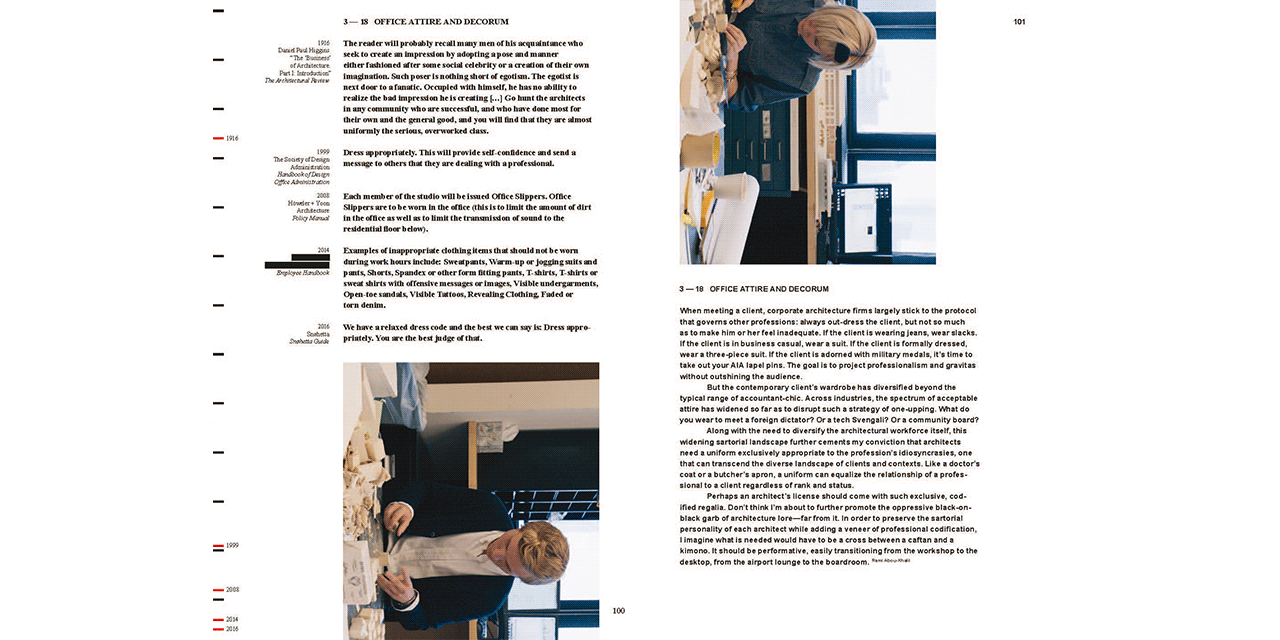 OfficeUS Manual is a critical, occasionally humorous and sometimes stupefying guide to the architectural workplace that documents and interrogates the protocols, policies and procedures of architectural offices. The book is the third publication of the OfficeUS series, which is dealing with the development of US architectural practices all over the world.
