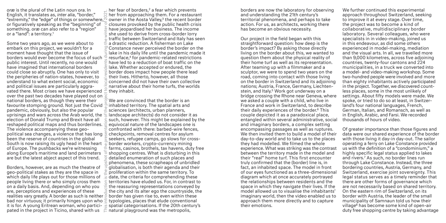 This guide invites readers to an unplanned journey inside oræ. It is a non-hierarchical succession of fragmentary narratives coming from borders and the imaginations of those living in their vicinity.