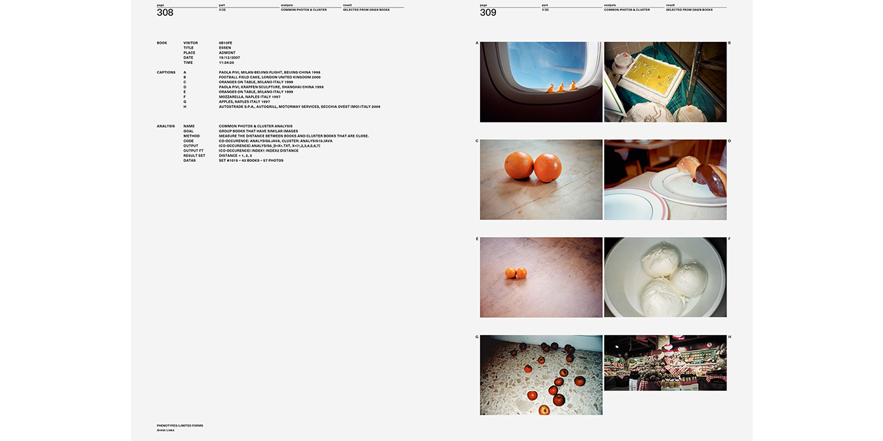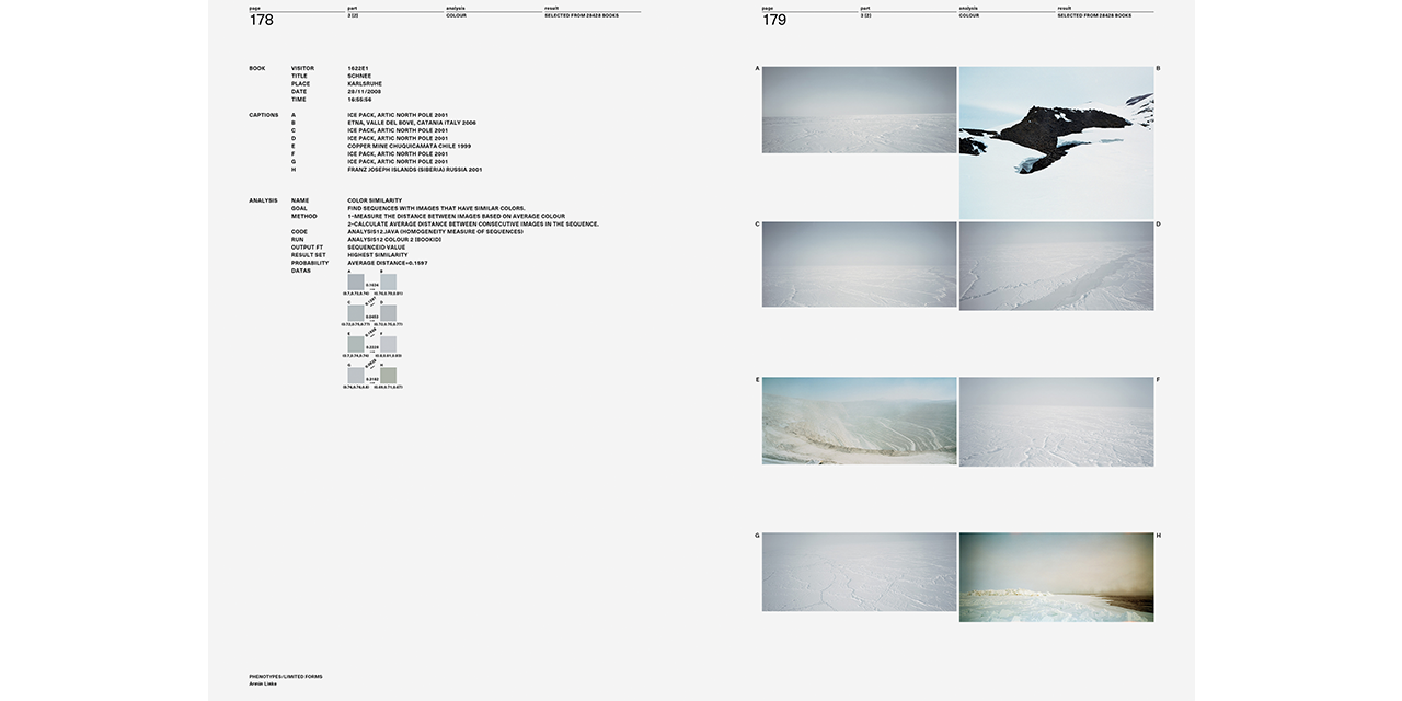 This publication acts as an extension of the interactive exhibition and social experiment; it analyzes the 30.000 sequences selected by the public. Algorithms help understand the connection between the photographs, the number of times they were chosen by an individual visitor and how the visitors named their personal selection of images.