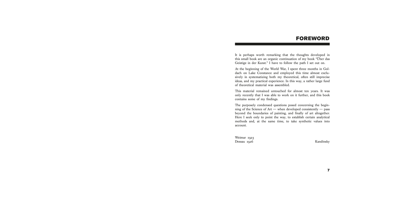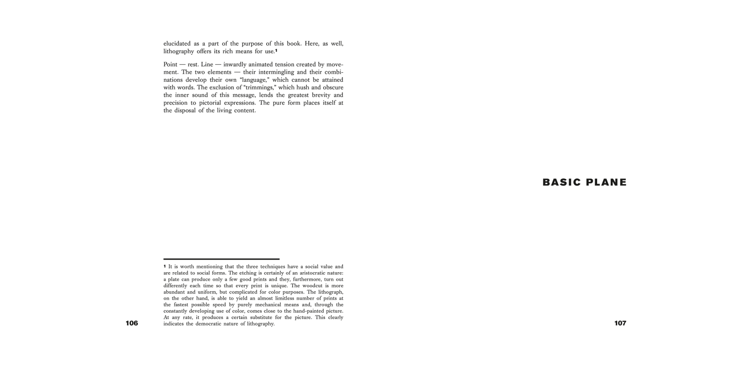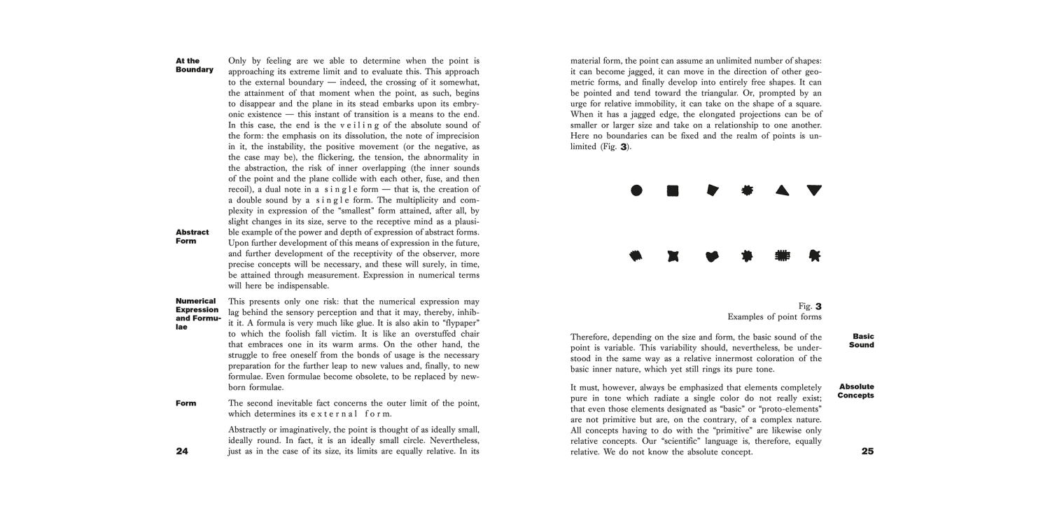 Point and Line to Plane, volume 9 of the Bauhausbücher series, can be seen as a continuation of Wassily Kandinsky's seminal treatise On the Spiritual in Art. Kandinsky's thesis is that different constellations of point, line and surface have different emotional effects on the viewer. Starting from the point (which represents the most concentrated and minimal graphic form), he understands all painterly forms as being a play of forces and counterforces: of contrasts.