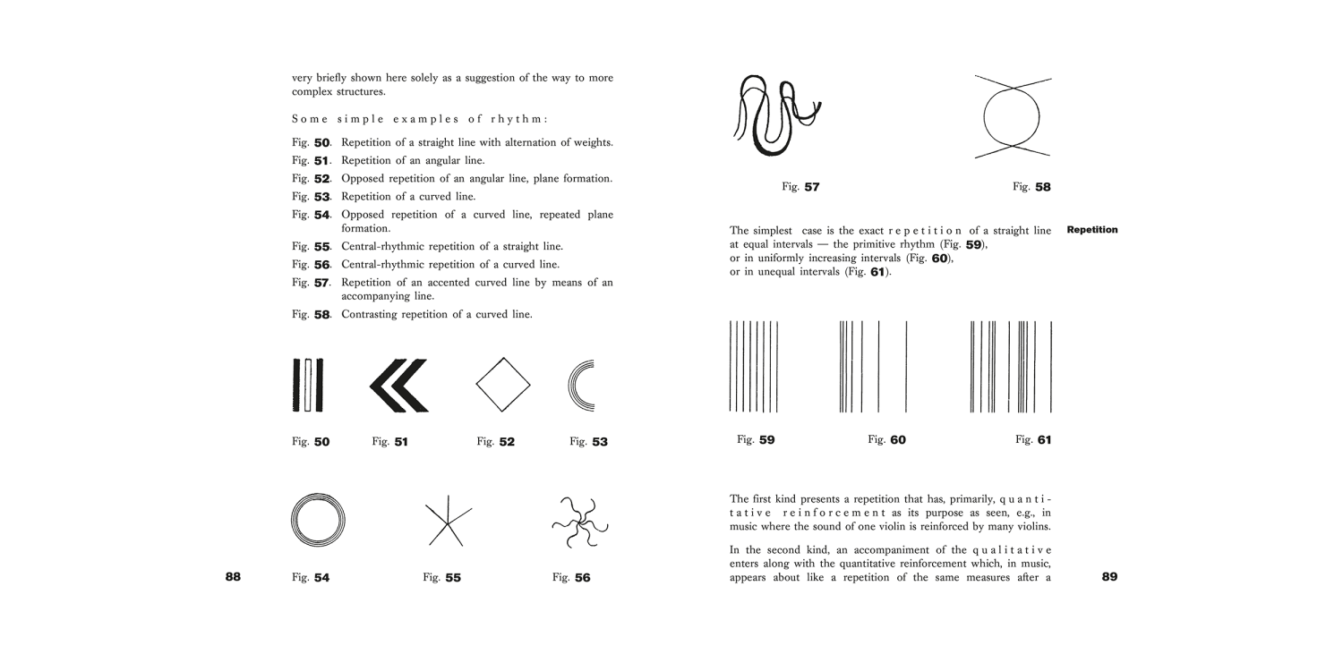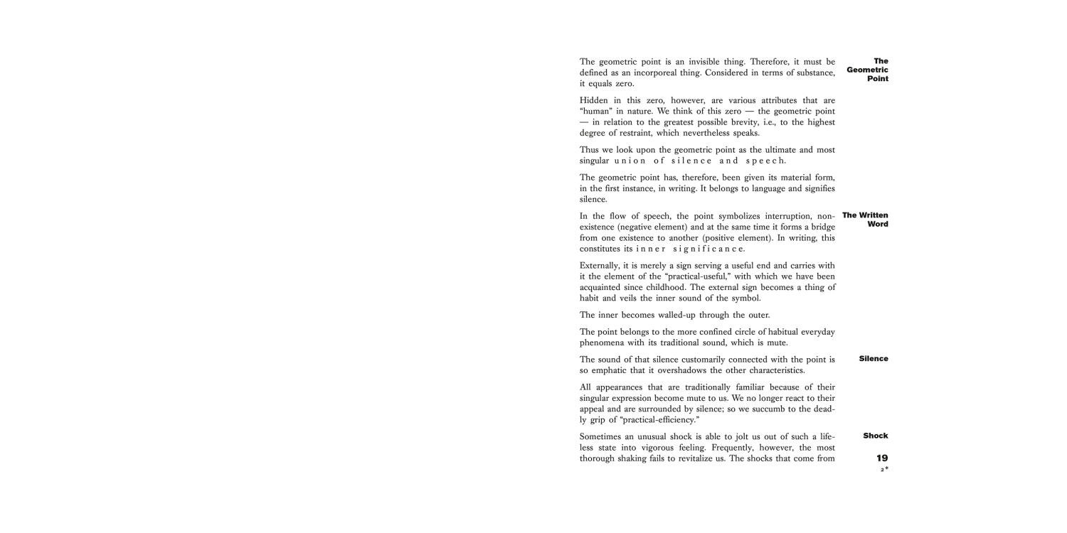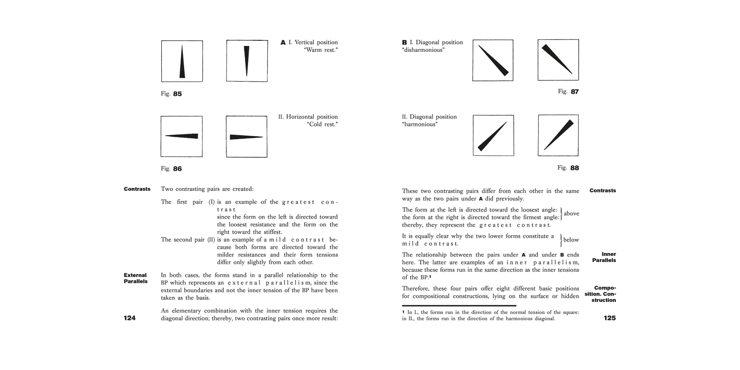 Point and Line to Plane, volume 9 of the Bauhausbücher series, can be seen as a continuation of Wassily Kandinsky's seminal treatise On the Spiritual in Art. Kandinsky's thesis is that different constellations of point, line and surface have different emotional effects on the viewer. Starting from the point (which represents the most concentrated and minimal graphic form), he understands all painterly forms as being a play of forces and counterforces: of contrasts.