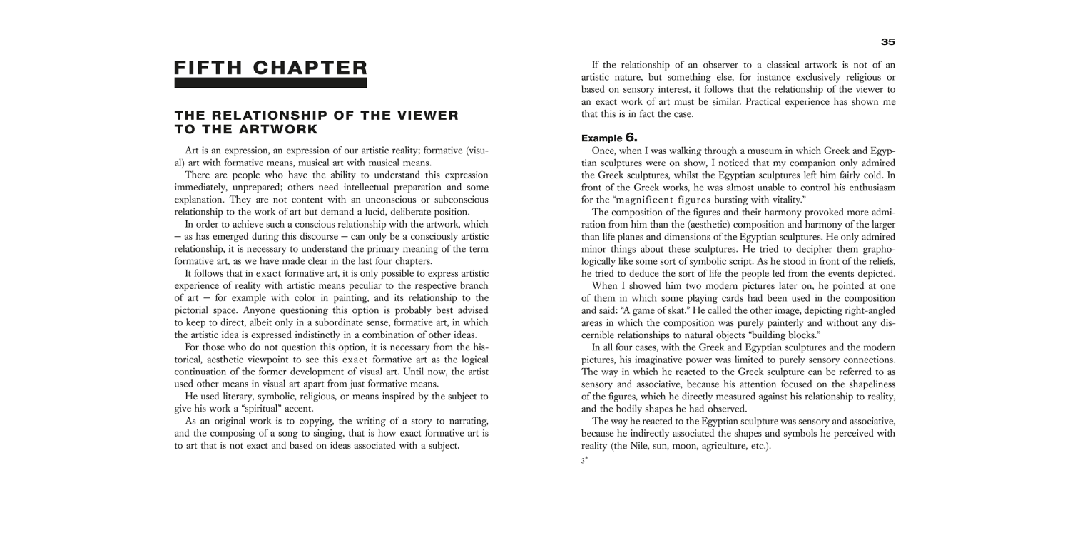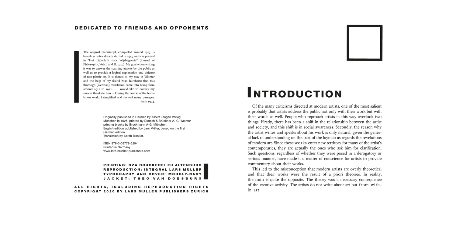 Theo van Doesburg was a jack of all trades: painter, writer, architect, typographer, and art theorist. In this volume of the Bauhausbücher, he attempts to make elementary concepts in the visual arts generally comprehensible. He was addressing the “modern artist” of his day, who had to deal with both shifting social paradigms and a changing understanding of art and art theory. Van Doesburg describes theory as a necessary consequence of creative practice. Artists, he says, “do not write about art but from within art.”
