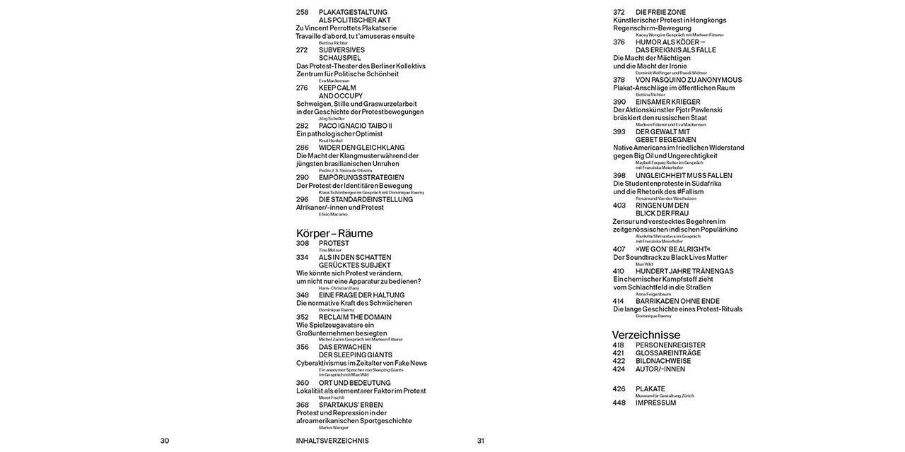 «Einen Blick in die Zukunft wirft auch die äusserst reichhaltige Publikation «Protest. Eine Zukunftspraxis», die bei Lars Müller Publishers erschienen ist. Die Autoren werfen hier die Frage nach der Relevanz des Protests in einer Zeit, in der im Gegensatz zu 1968 keine klaren ideologischen Fronten mehr auszumachen sind, auf.»