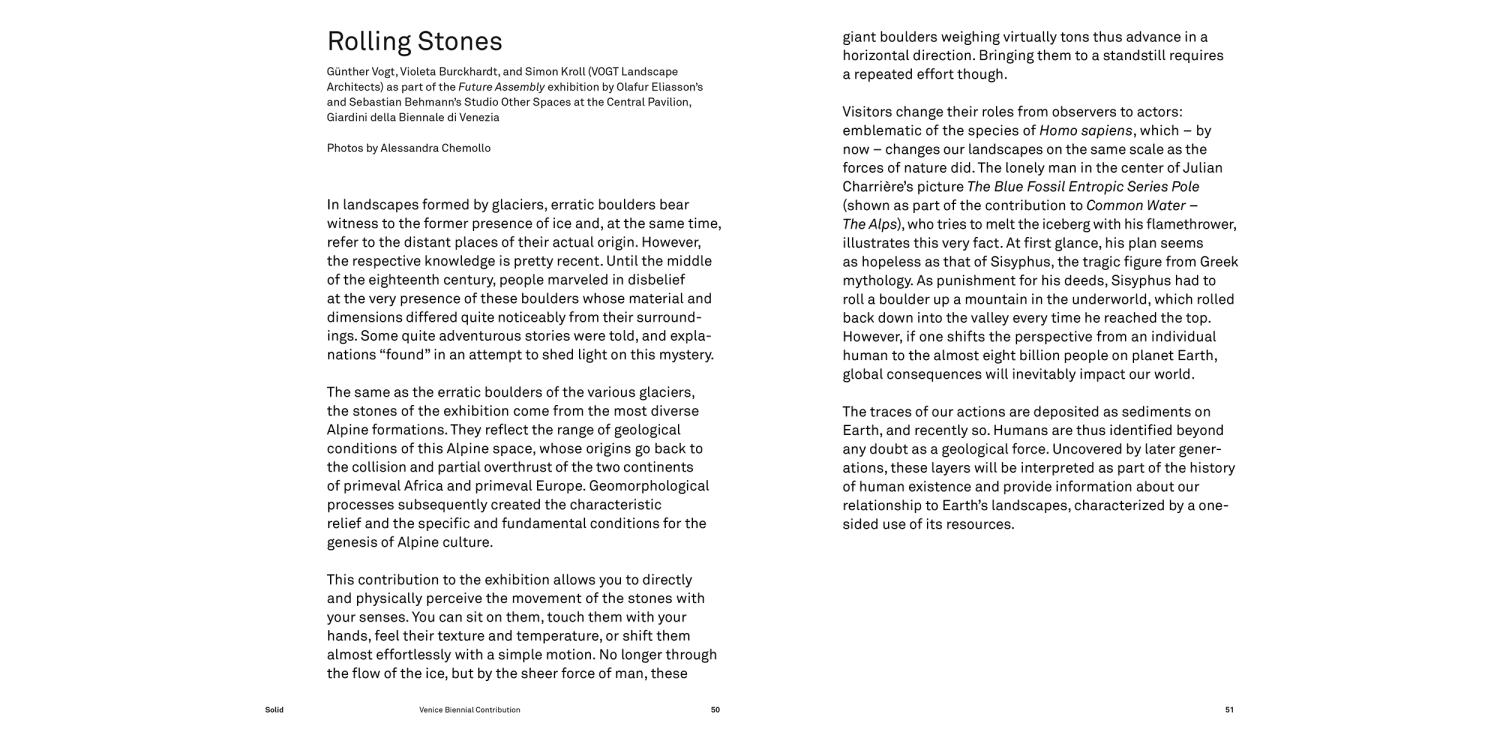 Various phenomena of this dynamic landscape were explored within the scope of the 17th Architecture Biennial in Venice by VOGT Landscape Architects and the Chair of Günther Vogt at ETH Zurich. This book documents their findings, and the phenomena are examined by focusing on the three thematic fields of geology, hydrology, and biology in scientific essays, art interventions, and on field trips.