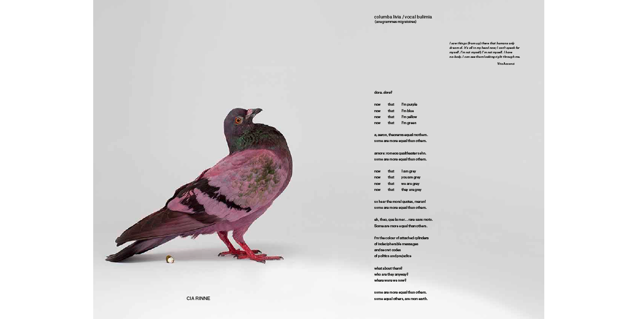 For the book Some Pigeons Are More Equal Than Others, poets, philosophers and thinkers were confronted with portraits of the vibrantly colored birds and asked to enter into a fictional dialogue with the creatures. The result is an anthology of poetry and prose, creative writing and ideas – an urban manifesto evolving ideas on the role of public domains and the encounter with contemporary art today.