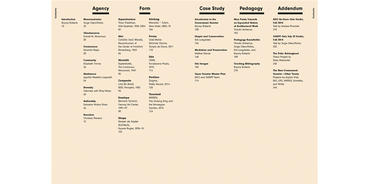 The book includes a series of discussions about pedagogical strategies for integrating knowledge from various related fields. The publication grew from a collaboration between the Oslo School of Architecture and Design and Columbia GSAPP on the planning of the national government quarter in Oslo.