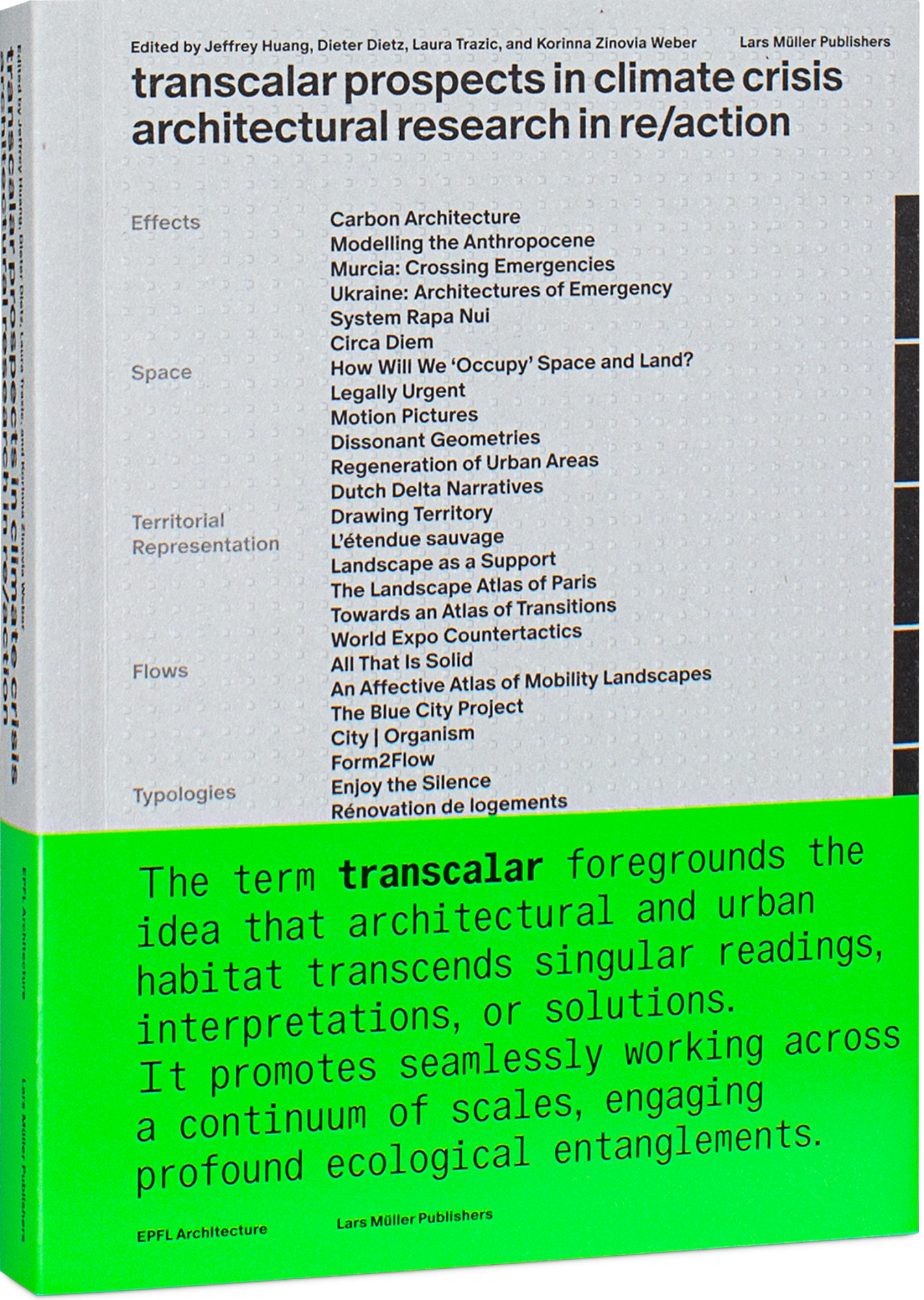Architectural research is in re/action to this climate crisis. “Transcalar Prospects in Climate Crisis” offers a vital compilation of research projects and essays reflecting the investigative efforts at EPFL Architecture. Addressing critical issues like material uses, land and soil degradation, environmental justice and circular urban flows, the book brings together diverse, entangled perspectives and transcalar vantage points. It navigates complex factors such as comfort, standards, profit and individual needs, across a wide ecological spectrum. The book is a must-read for architects, urban planners, designers, scholars, and anyone seeking knowledge and inspiration for climate action, urging a conscious and critical, transcalar response to one of the most pressing issues of our time.