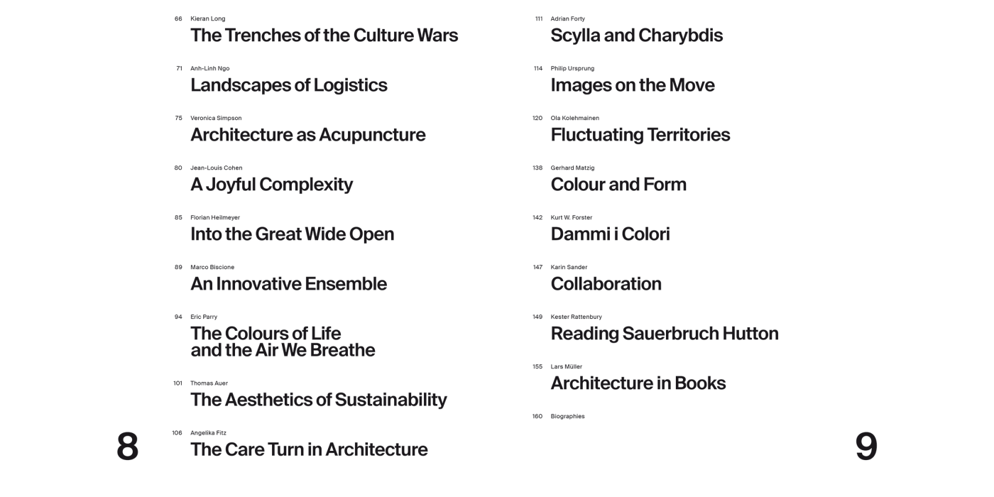 The authors include critics who have written on the work of the practice in the past, architectural colleagues and writers whose opinions and observations are respected by the editors as well as a handful of people who either live or work in one of their buildings and so have experienced Sauerbruch Hutton’s architecture firsthand. A photographic essay by the Finnish artist Ola Kolehmainen augments the twenty-five essays with works created between 1990 and 2020.