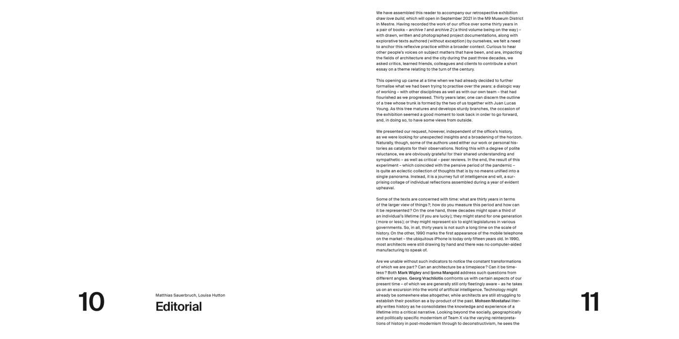 For this multifaceted reader, Matthias Sauerbruch and Louisa Hutton have asked a diverse group of authors to reflect on the various conditions that have shaped the conception, production and dissemination of architecture in Europe over the course of the last three decades, and of the architecture that has resulted. The essays generally include observations on one or more of Sauerbruch Hutton’s buildings, but these do not necessarily form the focus of the respective texts.