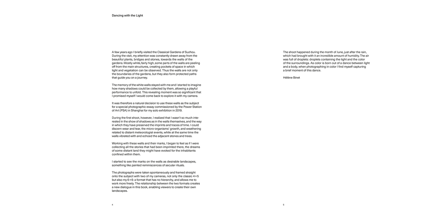 At the Classical Gardens of Suzhou in China, surface transforms into space; walls become landscapes. In her journey through this UNESCO World Heritage Site, Swiss French photographer Hélène Binet captures the traces of environmental influences on built structures. Her impressive series of photography shows how weather and time have turned blank walls into vivid depictions of nature. In Binet’s images, architecture becomes the frame for imaginary landscapes. By interweaving foreground and background, the artist tells stories that shift between the two dimensions of the plane and the three dimensions of space.