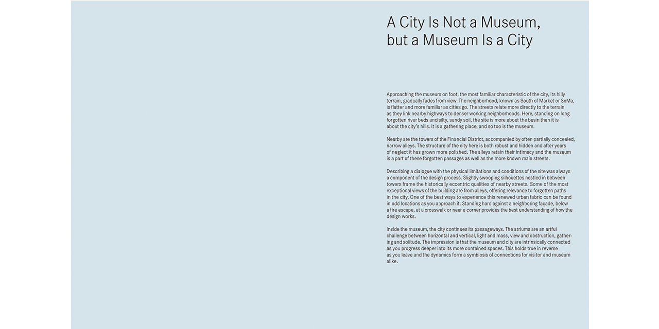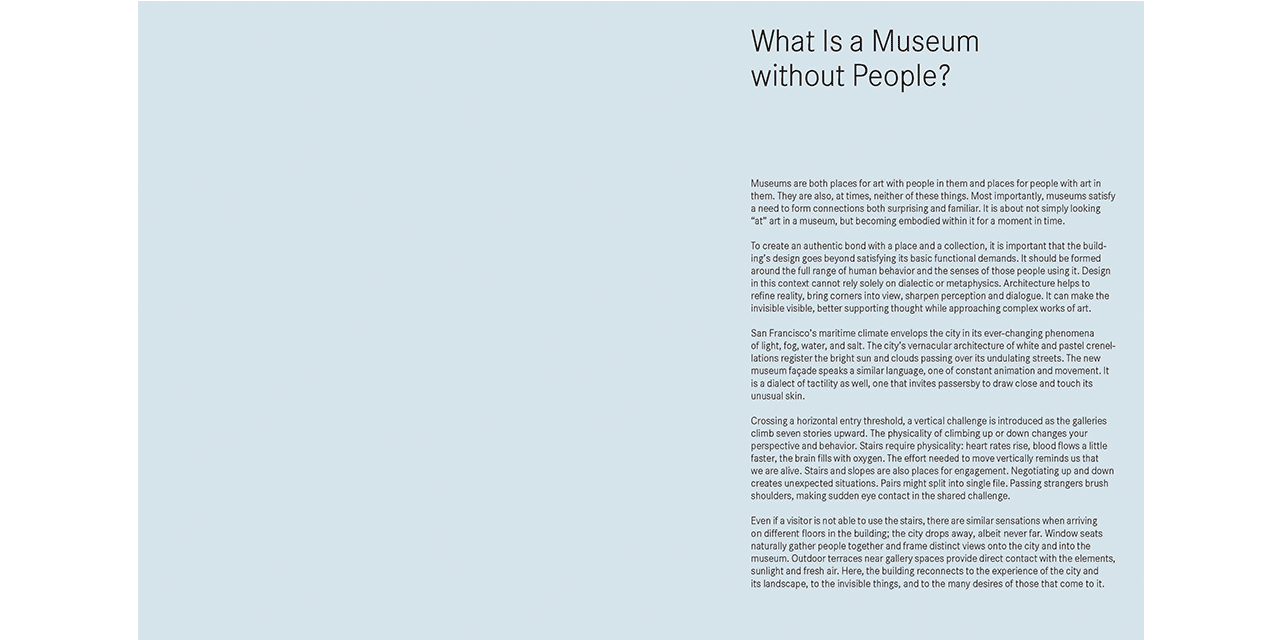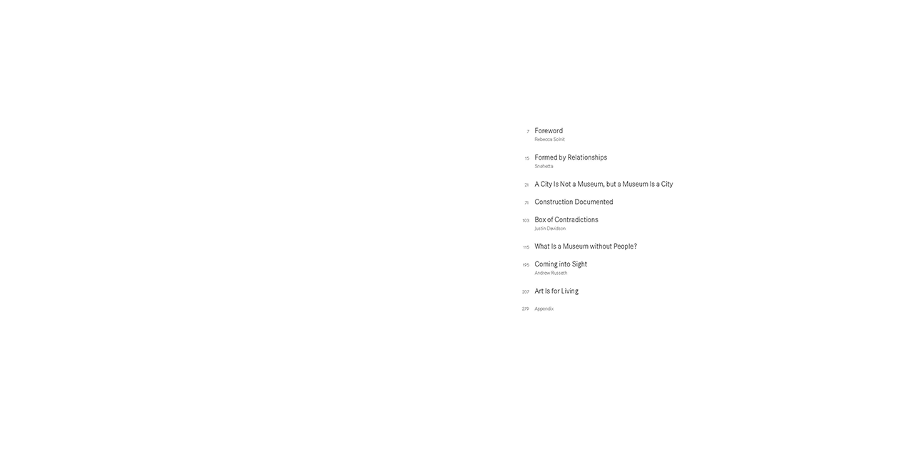 What is a Museum Now? asks for the role of a museum in contemporary society. This book contains a detailed and extensive documentation of the San Francisco Museum of Modern Art's expansion, conducted by Snøhetta. The studio evolved the SFMOMA as a new form of art appreciation where the experience is an extension of the life of the city itself. All of Snøhetta's work is formed by the interaction between humans and their physical surroundings. The design studio recognised that a museum is a mediator between art and life.