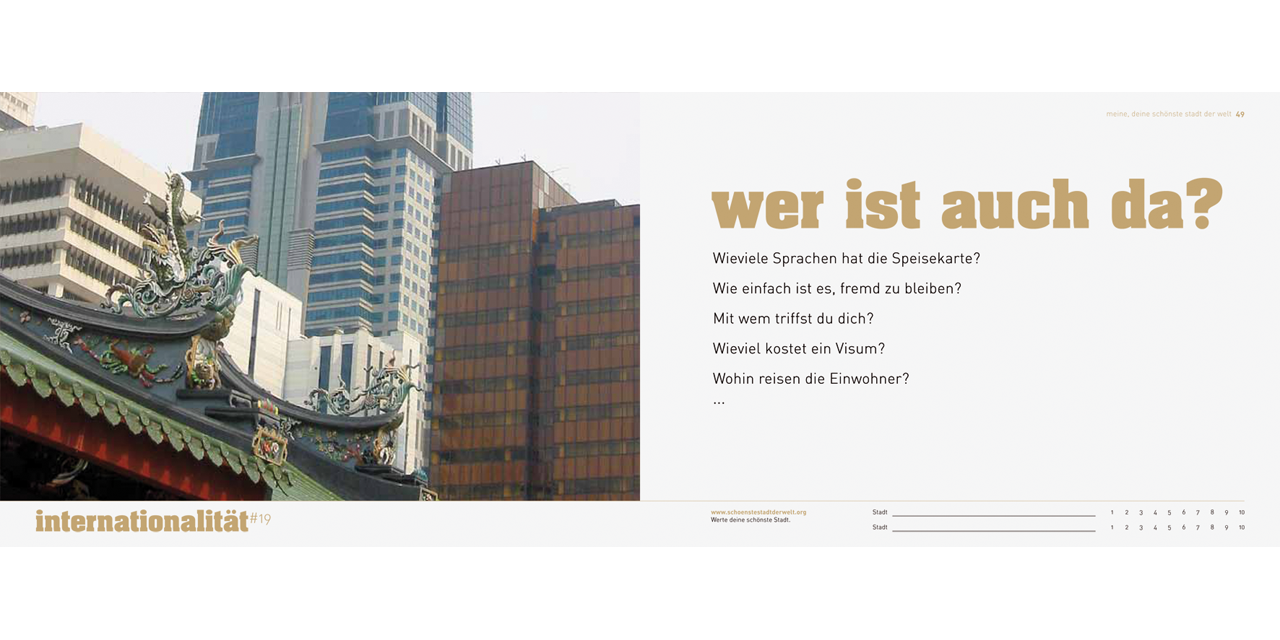Soon, more than two thirds of all human beings on the planet will live in cities, and the number of increasingly mobile people who shuttle effortlessly between major cities is constantly growing. Every year, various city rankings choose the “top ten” cities in the world. But what makes a city livable? The familiar rankings offer a very unsatisfactory answer to this question. Their economically oriented, quantitative criteria are often taken out of context and presented as universally desirable, and as the sole determining factors in evaluating quality of life. But personal experience is much more multilayered than this. Design2context began by studying established city rankings, then analyzed scenes from everyday urban life and developed criteria that make it possible to rationally examine urban quality of life from “softer” and more emotional perspectives. The result is fifty criteria and a questionnaire that invites the reader to actively reflect on his or her own personal criteria for urban quality of life. Essays by the researchers illuminate the scientific background of the study.