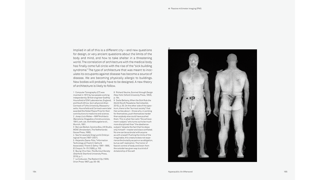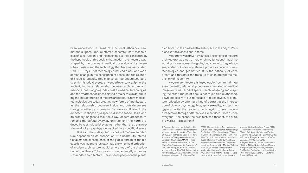 Beatriz Colomina traces the psychopathologies of twentieth-century architecture—from the trauma of tuberculosis to more recent disorders such as burn-out syndrome and ADHD—and the huge transformations of privacy and publicity instigated by diagnostic tools from X-Rays to MRIs and beyond. She suggests that if we want to talk about the state of architecture today, we should look to the dominant obsessions with illness and the latest techniques of imaging the body—and ask what effects they have on the way we conceive architecture.