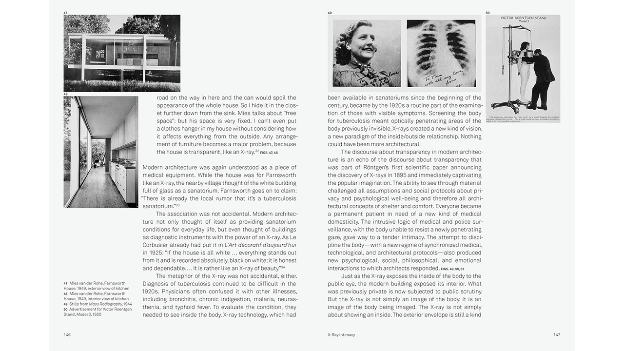 Modern architecture and the X-ray were born around the same time and evolved in parallel. While the X-ray exposed the inside of the body to the public eye, the modern building unveiled its interior, dramatically inverting the relationship between private and public. Architects presented their buildings as a kind of medical instrument for protecting and enhancing the body and psyche.