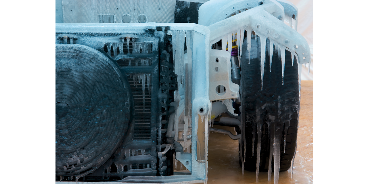 As part of its BMW H2R research project, Studio Olafur Eliasson is preparing a dense publication comprising extensive visual material; excerpts from two seminars held in 2006/2007; and conversations between Olafur Eliasson and a number of distinguished artists and thinkers. In the research project, Eliasson raises questions of formgiving and materiality, mobility, temporality, movement, and renewable energy. In 2005 a BMW H2R hydrogen-powered vehicle was delivered to Studio Olafur Eliasson and then stripped bare of its outer shell. To create a new skin several form studies have been carried out in a temporary geodesic dome, constructed in the yard of the studio. The final surface of the car consists of layers of ice, frozen around two intricate nets, mirrored plates and light. The “Climate car” can only exist in a microclimate with a temperature of minus 6 degrees Celsius or below.
